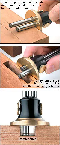 Überstände von bis zu 146 mm lassen sich einfach einstellen, da ein interner O-Ring eine leichte, aber konstante Reibung an jedem Stab erzeugt. Eine Rändelschraube arretiert die Einstellung. Die Messerräder aus gehärtetem Stahl markieren an jeder Stelle ihres Umfangs perfekt. Weil diese die Holzfasern schneiden und nicht reißen sind die Anrisse sehr sauber – sogar quer zur Holzfaser.