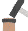 Nachdem die Zwinge über das Griffende gezogen ist, können Sie sie noch etwas mit dem Hammer nach unten schlagen. Bearbeiten Sie anschließend die Kante des Griffendes mit einem Hammer so, daß sie sich pilzförmig über die Zwinge legt - die damit dauerhaft befestigt ist. Sie erleichtern sich die Arbeit, indem Sie nach dem Aufstecken der Zwinge das Griffende mehrere Minuten in Wasser tauchen, und erst dann mit dem Hammer bearbeiten. Manche Hersteller sind dazu übergegangen, diese Arbeit bereits im Werk zu verrichten. Dann brauchen Sie es nicht mehr zu machen. Sie können das OIRE NOMI getrost mit dem Eisenhammer schlagen - so ist es in Japan üblich! Wichtig ist, daß hinten so viel Holz stehen bleibt, daß auf keinen Fall Stahl auf Stahl schlägt!