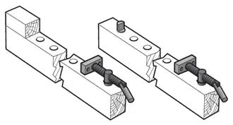 Im Kopf des Spannelements sind zwei Löcher, die es erlauben, verschieden geformte Zulagen festzuschrauben. Furniere verleimen an kurvigen Kanten wird damit genauso möglich wie die Verleimung von Bilderrahmen, deren Leisten auf Gehrung geschnitten sind.