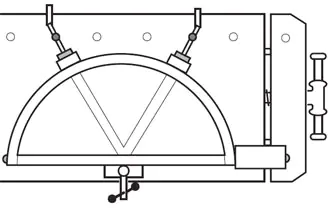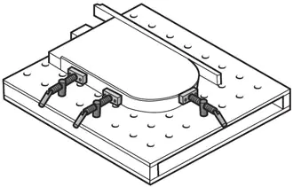 Runde Teile, sowie alle möglichen Werkstücke mit unregelmäßiger Form können mit den Veritas Spannzangen problemlos gespannt werden. Hier auf der Skizze sind sie mit den runden Bankhaken von VERITAS kombiniert. An der Anordnung der Löcher auf dieser Hobelbankplatte sehen Sie ein gutes Beispiel, wie die Möglichkeiten einer konventionellen Hobelbank erweitert werden können.