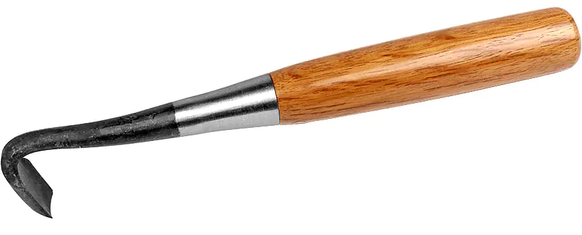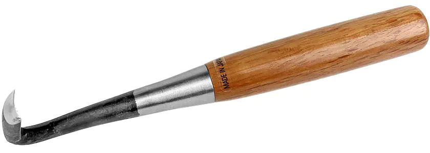Zum Schärfen empfehlen wir die japanischen Bildhauereisenschärfsätze. Zum Schärfen der äußeren Fase nehmen Sie den großen Stein vorgeformt für verschiedene Bildhauereisen. Für das Abziehen der Spiegelseite (hier die innere Seite gegenüber der Fase) empfehlen wir aufgrund der spezifischen Form dieses Werkzeugs vom konvex geformten Stein ein kleines Stück abzuschneiden, um an die Spiegelfläche zu gelangen. Geht gut mit einer Eisensäge!