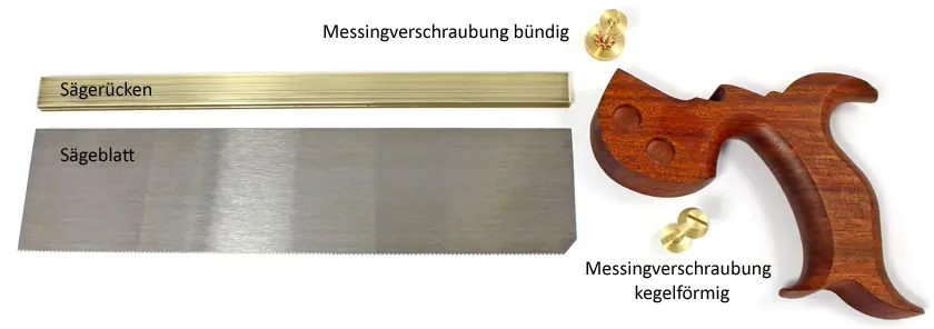 Wenn Sie schon länger davon träumten, eine Handsäge selbst zu bauen, können Sie das jetzt verwirklichen und eine große Befriedigung daraus ziehen, mit selbstgebautem Werkzeug zu arbeiten. Auf dieser Seite finden Sie (fast) alle Teile, die Sie dafür brauchen: von der geeigneten Verschraubung des Sägeblatts mit dem Griff bis zum geschlitzten Sägerücken und einem vorgefertigten Sägeblatt. Das einzige, was Sie komplett selbst anfertigen müssen ist der Handgriff aus Holz, wofür es weiter unten Links zu Vorlagen und Tipps zur Herstellung gibt.