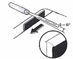 - Ist die Ziehklinge stumpf geworden, kann der Grat mit dem Ziehklingenstahl oder dem Ziehklingengratzieher mehrmals erneuert werden. Dabei muß der Ziehklingenstahl immer schräger gehalten werden - was auch für das Arbeiten mit der Ziehklinge zutrifft.
