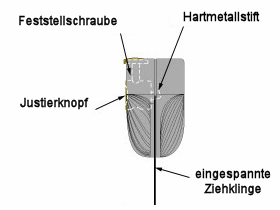 Nachdem Sie die Ziehklinge eingeschoben haben, ziehen Sie die Rändelschrauben nur ganz leicht an, so daß die Klinge noch beweglich ist. Stellen Sie jetzt die mittlere Anpreßschraube auf die gewünschte Durchbiegung ein. Erst jetzt drehen Sie die beiden äußeren Rändelschrauben fest zu. Dabei bleibt es Ihnen überlassen, ob Sie die Ziehklinge ganz hineinschieben oder nur teilweise. Sie haben damit eine weitere Variabilität beim Arbeiten.