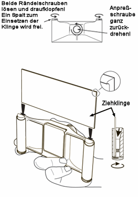 Zum Einsetzen der Ziehklinge drehen Sie die Schraube des Anpreßblocks in der Mitte des Halters ganz zurück. Dann lösen Sie die beiden außeren Rändelschrauben aus Messing und schlagen mit der Fingerspitze auf die Schraubenköpfe. Ein konischer Haltebolzen löst sich und gibt einen Spalt frei, in den die Ziehklinge eingeschoben wird.
