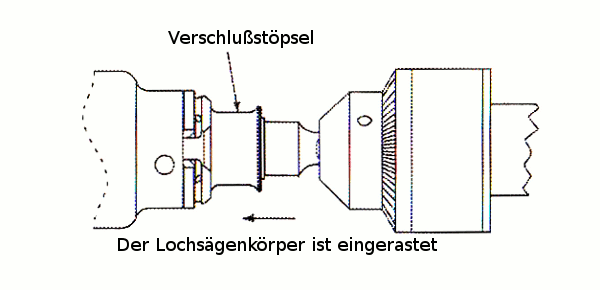 Durch die Kraft der Feder in der Aufnahme schnellt der Verschlussstöpsel nach vorne und rastet damit den Lochsägenkörper ein der nun sicher gehalten wird.