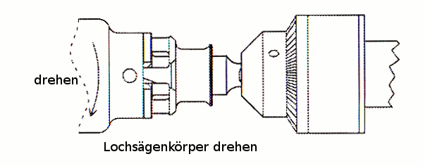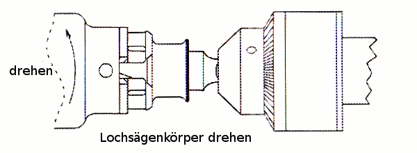 Drehen Sie den Lochsägenkörper leicht nach rechts bis er anschlägt.