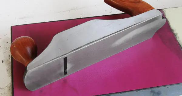 Der fertig abgerichtete Hobel: Sie sehen noch einen dunklen Streifen hinten in der Mitte. Dort hat das Schleifmittel die Sohle nicht erfasst. Die Wölbung nach innen ist mit unseren Bordmitteln nicht mehr messbar, da sie weniger als 1/50 mm beträgt. Der übrige, größte Teil der Sohle weist ein sehr gutes Finish auf. Ich habe entschieden an dieser Stelle aufzuhören da Aufwand und Ertrag in einem angemessenen Verhältnis stehen sollten und der Hobel in Bezug auf seine Funktion keinerlei Einschränkungen erfährt. Natürlich kann man auch noch das letzte Stück hinten glätten, dem Perfektionsdrang sind keine Grenzen gesetzt. Wenn Sie einen Hobel abgerichtet haben: trocknen Sie ihn gut ab und ölen Sie ihn hinterher damit der Rost außen vor bleibt. Das ganze dauerte knapp 60 Minuten. Den Zeiteinsatz kann man selbst steuern. Wenn es schneller gehen soll, wechseln Sie öfter das Schleifblatt, der Vorgang wird dann etwas teuerer.