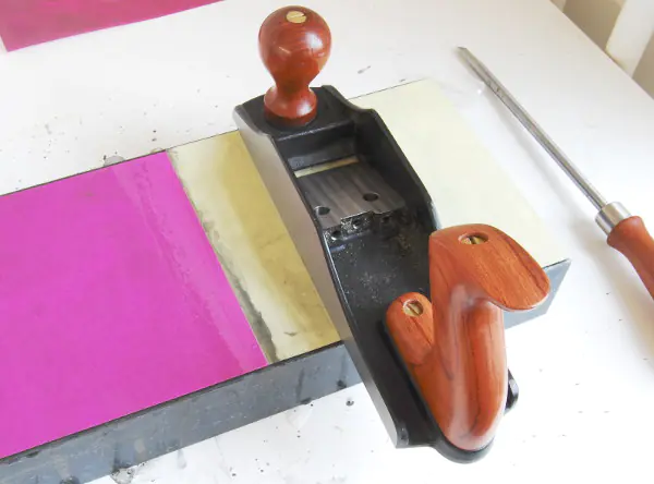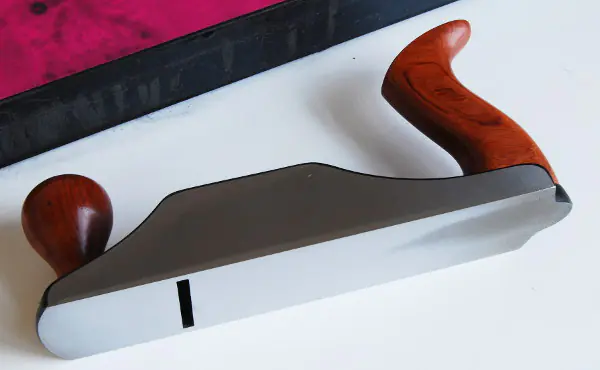Ein Juuma Putzhobel No. 4 hatte eine leicht hohle Sohle und ist beim Hobeln mit der vorderen linken Ecke (Bild) gegen ein Metallteil gestoßen. Die Delle vorne führte zu einer kleinen Auswölbung an der Sohlenkante. Das war eine Gelegenheit, unseren neuen Alox Finishing Film beim Abrichten der Sohle einzusetzen.