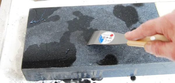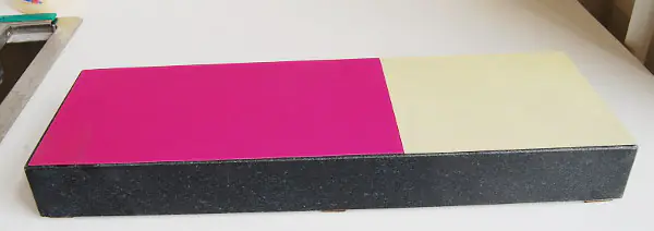 Gewählt wurden ein Blatt Alox Finishing Film mit 100 μ Korngröße (ca. P 150) für das Abrichten selbst und ein Blatt mit 40 μ (ca. P 400) zum Herausschleifen der Riefen, die das gröbere Blatt verursachte. Die Blätter haben eine Größe von 230 x 280 mm und entsprechen damit in der Größe üblichen Schleifblättern. Da kein passende Glasplatte zur Hand war, entschloss ich mich eine Granit-Messplatte mit den Maßen 457 x 152 x 51 mm zu nehmen, die es erlaubte beide Schleifblätter gleichzeitig auf der Oberfläche geklebt zu haben. Da die Oberfläche der Granitplatte etwas kleiner ist als die Fläche zweier Schleifblätter, schnitt ich das grobe auf 150 x 280 mm und das feine auf 150 x 170 mm und klebte beide auf die Platte. Die Alox Finishing Blätter haben eine selbstklebende Rückseite. Man sollte unbedingt darauf achten, dass die flache Unterlage völlig eben und fettfrei ist.