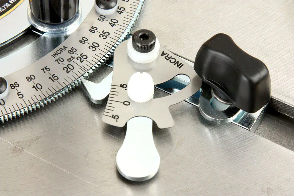 Der Winkelmesser mit 180 festen Winkeleinstellungen für jedes einzelne Grad und zusätzlichen Einrastpunkten bei 22,5° lässt Sie Fehler zuverlässig vermeiden. Ein zusätzlicher Nonius ermöglicht eine Einstellung auf 1/10° genau! Darüber hinaus ist er mit einem 464 mm langen, auf 787 mm ausziehbaren profilierten Teleskopanschlag aus Aluminium versehen. Der mitgelieferte zurück klappbare "Shop Stop" Anschlag erlaubt präzise Ablängeinstellungen. Vorhanden sind außerdem metrische und Inch Skalen, die für die Aufnahmeschlitze des Anschlags vorgesehen sind. Auch für den Zuschnitt von Teilen für das Segmentdrechseln geeignet, z. B. kann für 7-seitige Objekte 25,7° und für 10-seitige Objekte 18° eingestellt werden, um die Teile präzise zu duplizieren.