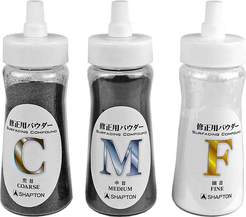 Für Schleifsteine im mittleren Kornbereich von 1000 bis 2000 nehmen Sie das mittlere Schleifpulver. Wenn diese Steine jedoch stark deformiert sind, können Sie auch das grobe Pulver nehmen.
