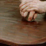 Benutzen Sie zunächst zu Beginn des Deckpolierens den Grundierballen weiter, indem Sie ihn mit Schellackpolitur tränken und in kreisenden Bewegungen über die Fläche führen. Im Grundierballen sind noch Bimssteinreste enthalten, die bei der Bearbeitung sowohl die Lackschicht aufbauen als auch die Fläche schleifen. Nach jedem neuen Tränken des Ballens ist es ratsam, etwas Polieröl (eine Pipette ist sehr gut dafür) direkt auf die Fläche zu geben. Damit werden Wischer vermieden oder reduziert, die mit zu feuchtem Ballen entstehen. Beim Entstehen dieser Wischer wird die bereits aufgetragene Schicht wieder angelöst und damit reduziert und fangen mehr oder weniger von vorne an. Mit fortschreitender Dicke der Lackschicht sollte der Grundierballen gegen einen Ballen ausgetauscht werden, mit dem nur Deckpolierarbeiten durchgeführt werden. Dieser Lappen sollte mit einem etwas feineren Tuch, etwa einem alten Geschirrhandtuch, bespannt werden. Wenn mit dem Grundierballen weitergearbeitet werden würde, würde der dort enthaltene Bimsstein nun lästige Schleifspuren auf der Lackfläche hinterlassen.