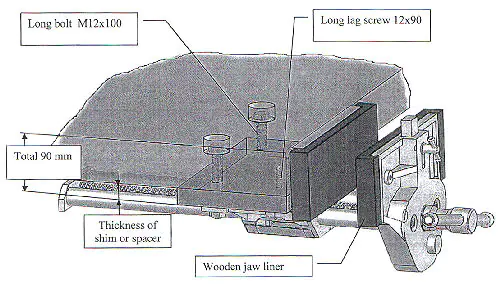 Der Schraubstock sollte mit ausreichend großen Schrauben auf einer Platte, die nicht kippen kann, befestigt werden. Denken Sie daran, dass dieser Schraubstock fast 16 kg wiegt! Wir empfehlen für die rückseitigen Löcher M12-Gewindeschrauben mit Sechskantkopf, die von oben in der Platte versenkt sind. Für die vorderseitigen Löcher (also nahe an der Backe) empfehlen wir 12 mm starke Holzschrauben mit Sechskantkopf, Verschraubung von unten. Köpfe und Muttern der Schrauben sollten mit Unterlegscheiben versehen werden. Details siehe Bild!