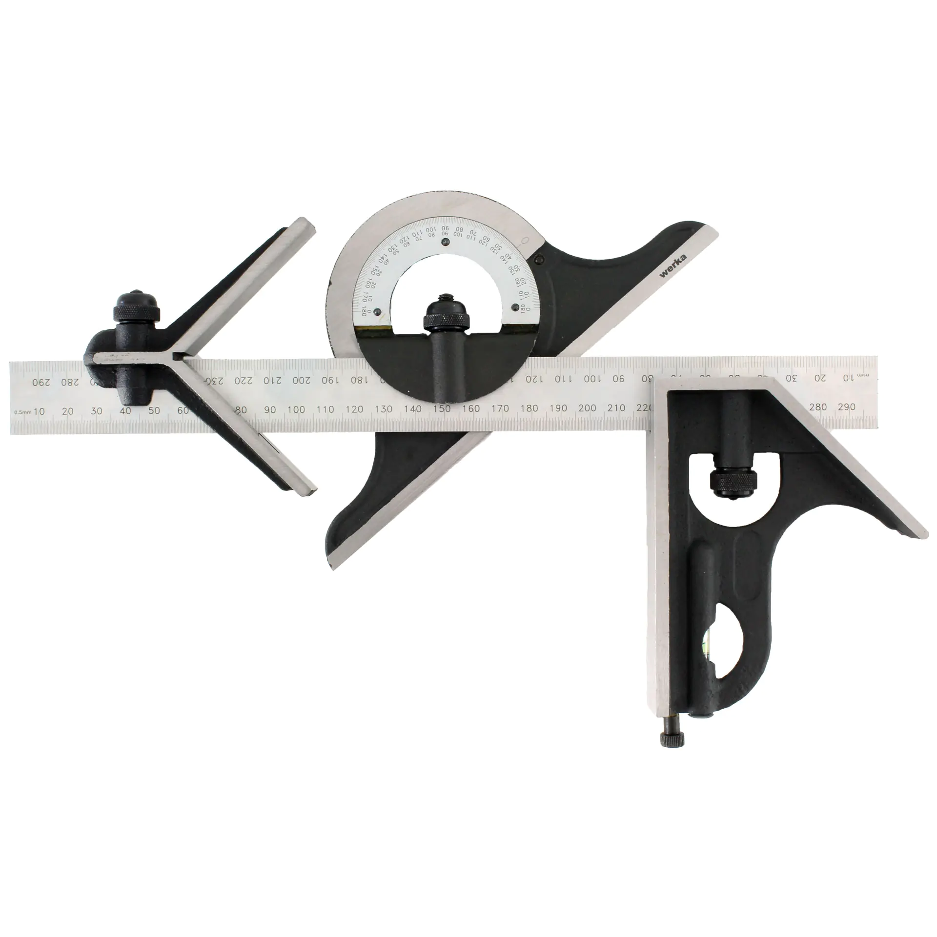 Häufig ist auch eine kleine Wasserwaage integriert, ebenso wie eine Anreißnadel. Der Kombinationswinkel eignet sich hervorragend zum Prüfen und Anreißen rechter und schräger Winkel, zum Übertragen von Maßen, zum Messen von Tiefen sowie zum parallelen Anreißen von Linien.
